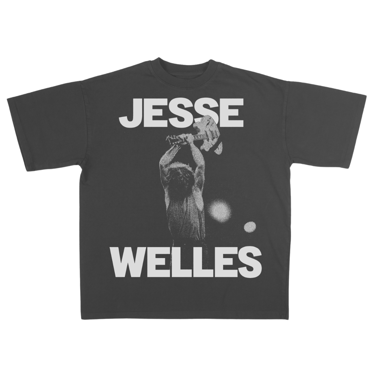 This 100% cotton t-shirt is unisex and pigment-dyed with a greyscale image of Jesse Welles smashing a guitar on stage printed prominently across the chest and accompanied by iconic lyrics.